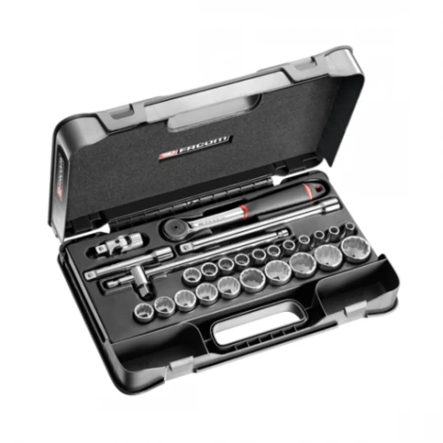 Ce jeu 26 pièces douilles 1/2” 12 pans métriques S.161-4P12 de Facom contient de divers outils à mains multifonctions comme le cliquet pour les serrages des pièces et les douilles pour manipuler les écrous, etc.