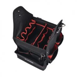 Sac Ă outils toile rigide avec base polypropylĂšne Ă©tanche. Multi-compartiments. ĂquipĂ© dâune bandouliĂšre rĂ©sistante.